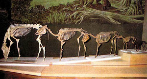 Təqribən 50 milyon il əvvəl yaşamış dörd dırnaqlı, tülkü böyüklüyündəki canlılardan dövrümüzdəki daha böyük tək dırnaqlı ata doğru ardıcıl mərhələli dəyişiklik olduğunu irəli sürən məşhur atın təkamülü nümunəsinin əsassız olduğu uzun zamandan bəri məlumdur. Mərhələli dəyişiklik əvəzinə hər növün fosilləri tamamilə fərqli şəkildə ortaya çıxmış, dəyişilmədən qalmış, daha sonra nəsli kəsilmişdir. Ara keçid formalar yoxdur.